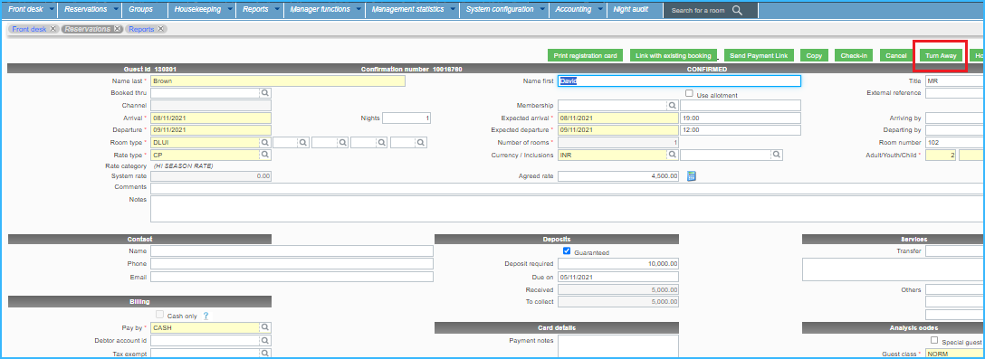 A new feature, the “Turn away guest” button, has been added to the reservation screen. This button allows the reservation team to mark a guest’s enquiry has turned away instead of cancelling it. This distinction helps ensure that such enquiries do not negatively impact the hotel’s productivity reports and overall performance metrics. By using this feature, hotels can better track and manage potential guests who were interested but did not book, providing more accurate data for performance analysis.