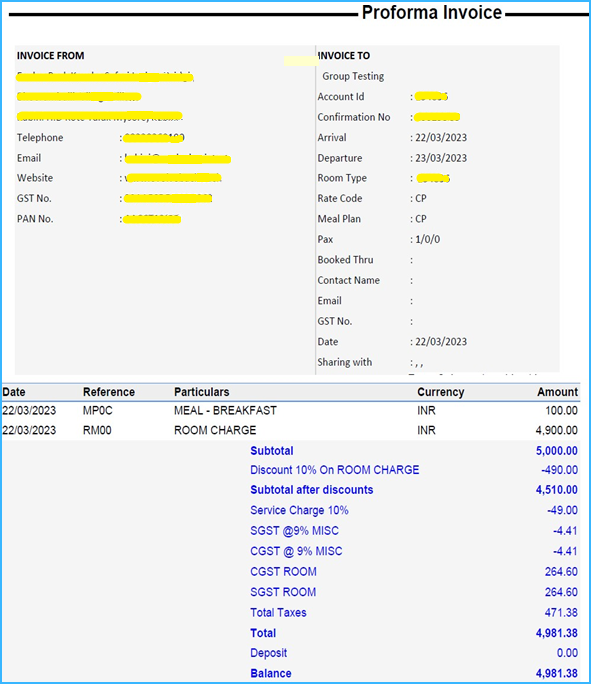 GST invoices have been modified to show complete details of guests along with group and corporate information as shown in the above screen.